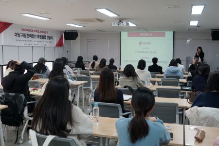 ▲ 굿럭굿잡 캠페인 전달식에서 이랜드재단을 소개하는 모습 지난 3월 7일, 독산 이네스트 드림홀에서는 세계 여성의 날을 맞아 여성 자립준비청년을 위한 특별한 캠페인이 열렸습니다. 자립준비청년들은 만 18세가 되면 보호시설을 떠나 홀로서기를 시작해야 하지만, 취업 준비 과정에서 정보 부족과 경제적 부담으로 어려움을 겪는 경우가 많습니다.