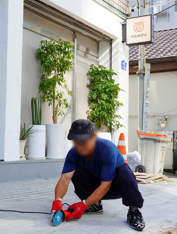 ‘아침애(愛)만나’ 무료급식소에서 새 삶을 찾은 도근 씨(가명)가 시설을 수리하고 있다./ 이랜드 복지재단 제공 기력이 돌아오자, 그는 건설 현장에서 일하던 실력을 발휘해 무료 급식소에 보수가 필요한 곳을 찾아 고치기 시작했다. 어르신들이 출입하기 어려웠던 입구 문턱에 계단을 설치하고, 식자재를 보관할 선반을 설치했다. 벗겨진 페인트도 다시 칠하고 깨진 타일도 보수하는 등 급식소를 조금씩 가꾸어 나갔다. 도근 씨는 이곳에서 가족들과 재회할 힘을 키웠다.